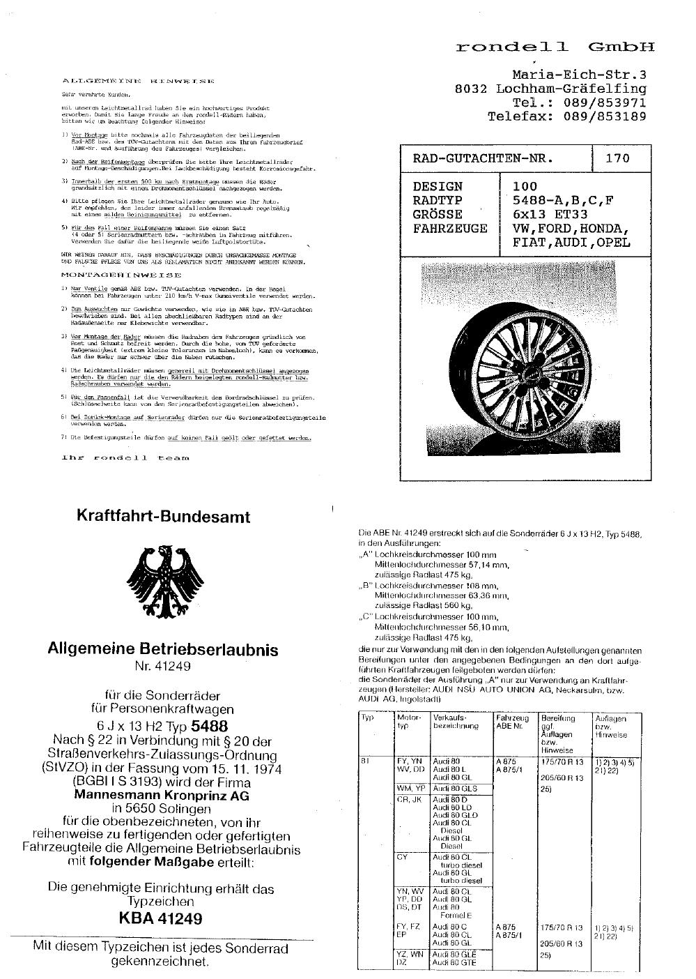 Dieses Gutachten (abe) bezieht sich auf die Alufelge Rondell Design 100, Typ 5488, Ausführung A/B/C/D/E/F in der Ausführung ET 0, Mittenloch 0 mm (KBA 41249). Im PDF findest du typischerweise zulässige Reifengrößen, Auflagen/Anbauhinweise und – je nach Dokument – Hinweise zur Eintragung.