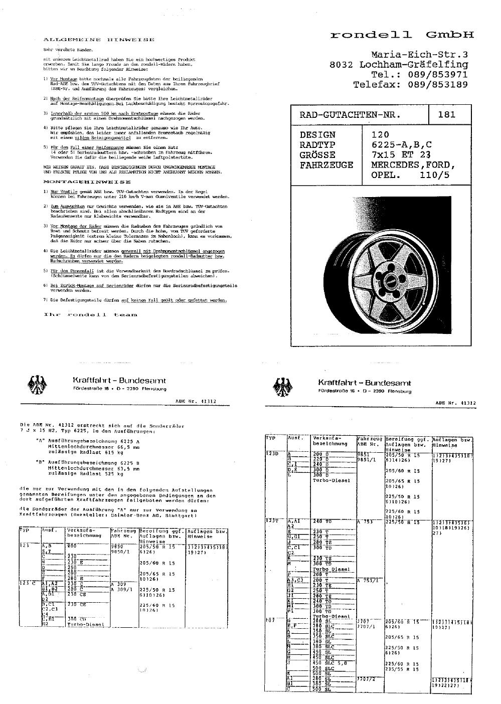 Dieses Gutachten (abe) bezieht sich auf die Alufelge Rondell 120 in der Ausführung ET 0, Mittenloch 0 mm (KBA 41312). Im PDF findest du typischerweise zulässige Reifengrößen, Auflagen/Anbauhinweise und – je nach Dokument – Hinweise zur Eintragung.