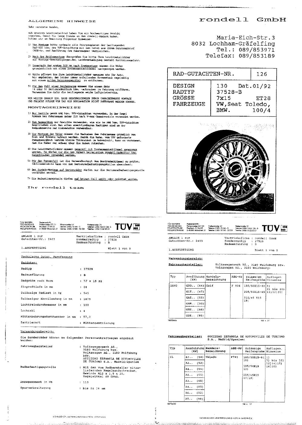 Felgengutachten / abe für Alufelgen Rondell Design 130, Radtyp 37528 / 37528-B / 37528-D / 37528-F / 37528-Q / 37528-U / 37528-Z u.a. (Nachträge und Ausführungen im Dokument) (ET 0, Mittenloch 0 mm) mit KBA 41937 (Zertifikatsnummer 41937). Hier kostenlos als PDF herunterladen. Der Download-Link ist 24 Stunden gültig und kann bis zu zwei Mal verwendet werden.