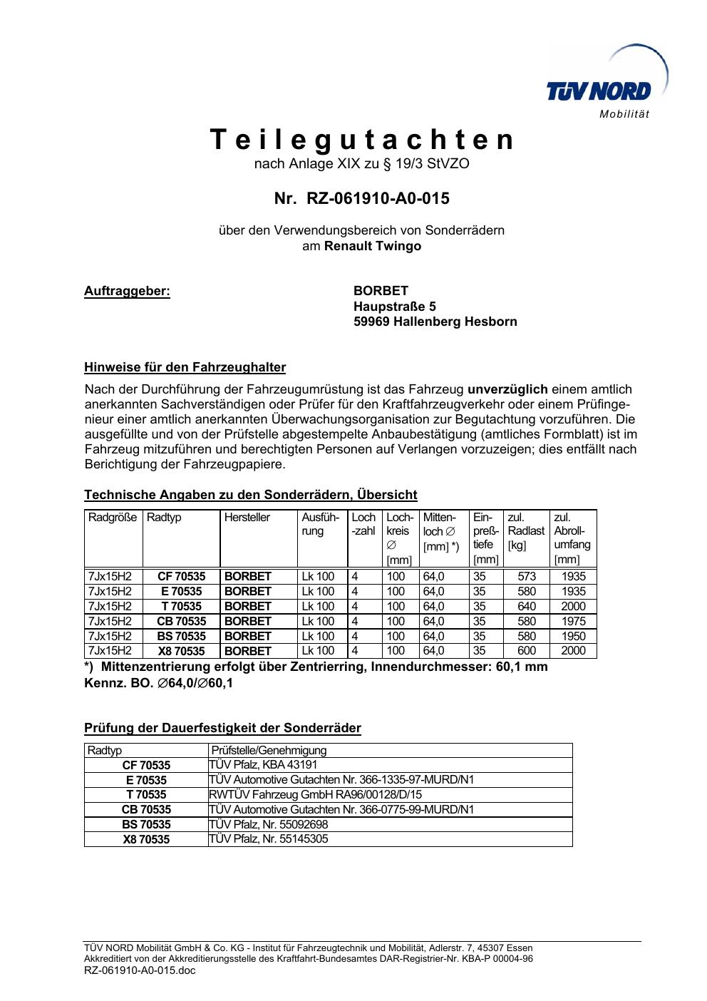Dieses Gutachten (abe) bezieht sich auf die Alufelge Borbet TS85930 in der Ausführung 7Jx15 ET 0, Mittenloch 0 mm (KBA 43191). Im PDF findest du typischerweise zulässige Reifengrößen, Auflagen/Anbauhinweise und – je nach Dokument – Hinweise zur Eintragung.