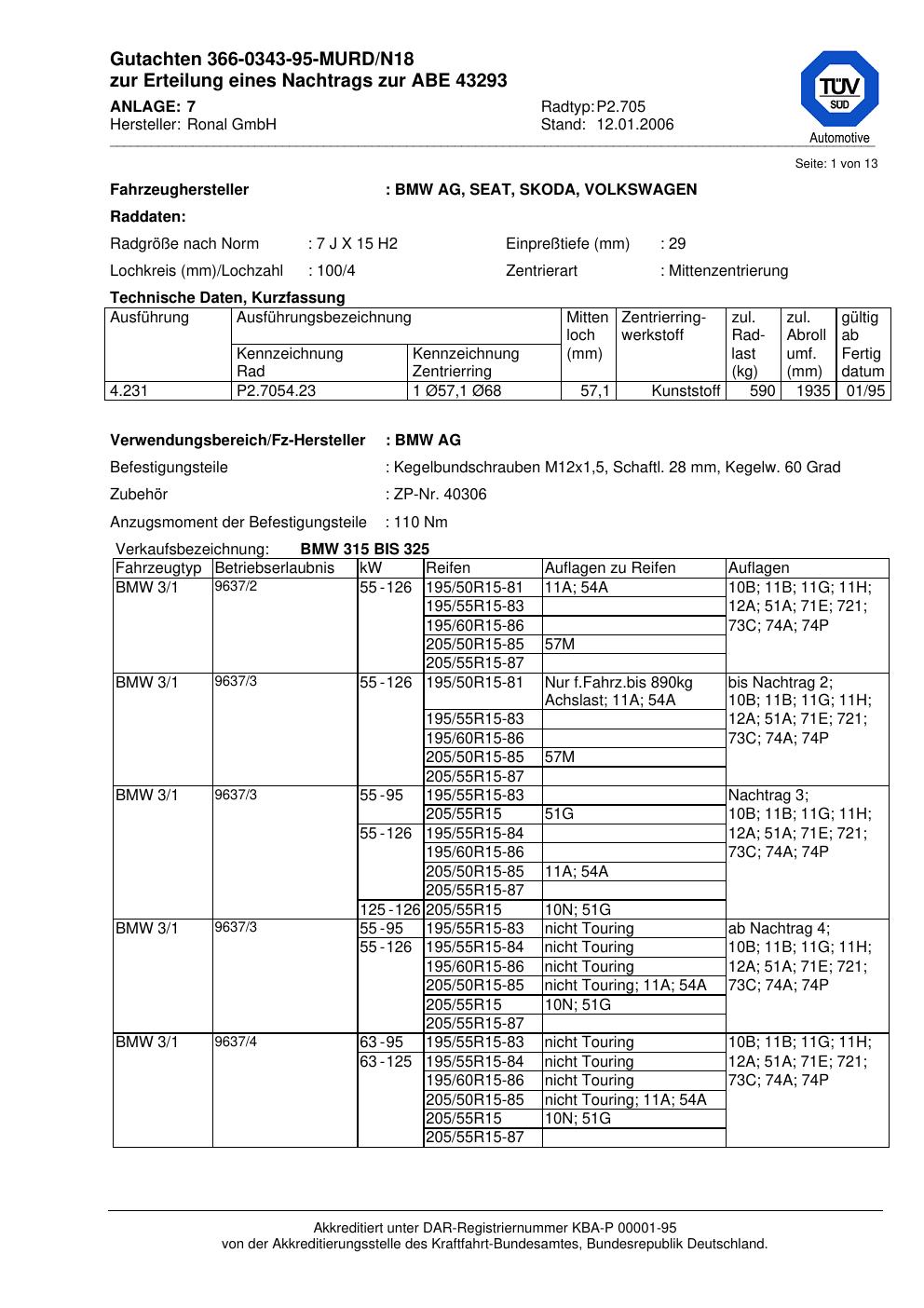 Felgengutachten / abe für Alufelgen Ronal P2.705 (7Jx15 ET 0, Mittenloch 0 mm) mit KBA 43293 (Zertifikatsnummer 43293). Hier kostenlos als PDF herunterladen. Der Download-Link ist 24 Stunden gültig und kann bis zu zwei Mal verwendet werden.