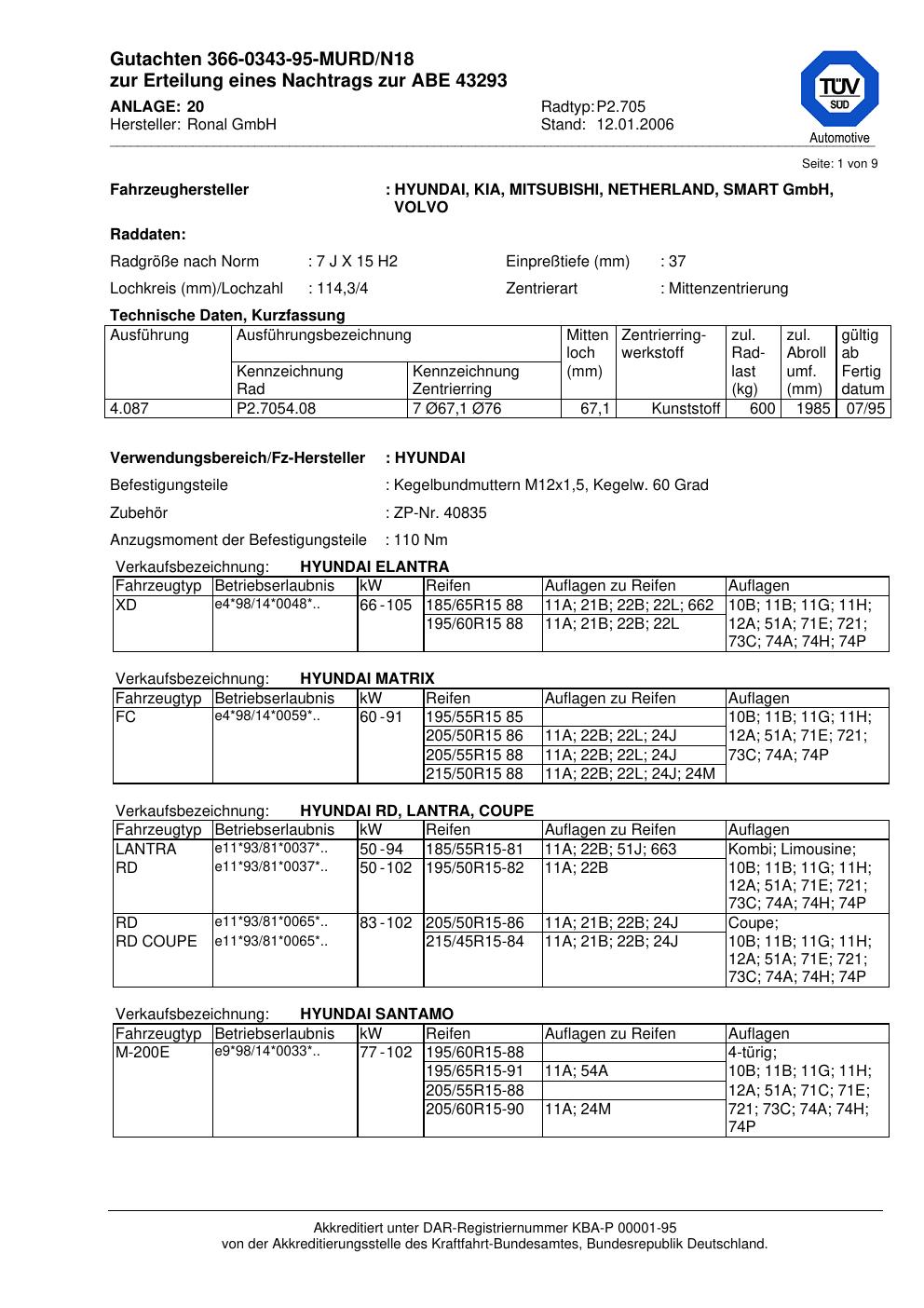 Dieses Gutachten (abe) bezieht sich auf die Alufelge Ronal P2.705 in der Ausführung 7Jx15 ET 0, Mittenloch 0 mm (KBA 43293). Im PDF findest du typischerweise zulässige Reifengrößen, Auflagen/Anbauhinweise und – je nach Dokument – Hinweise zur Eintragung.