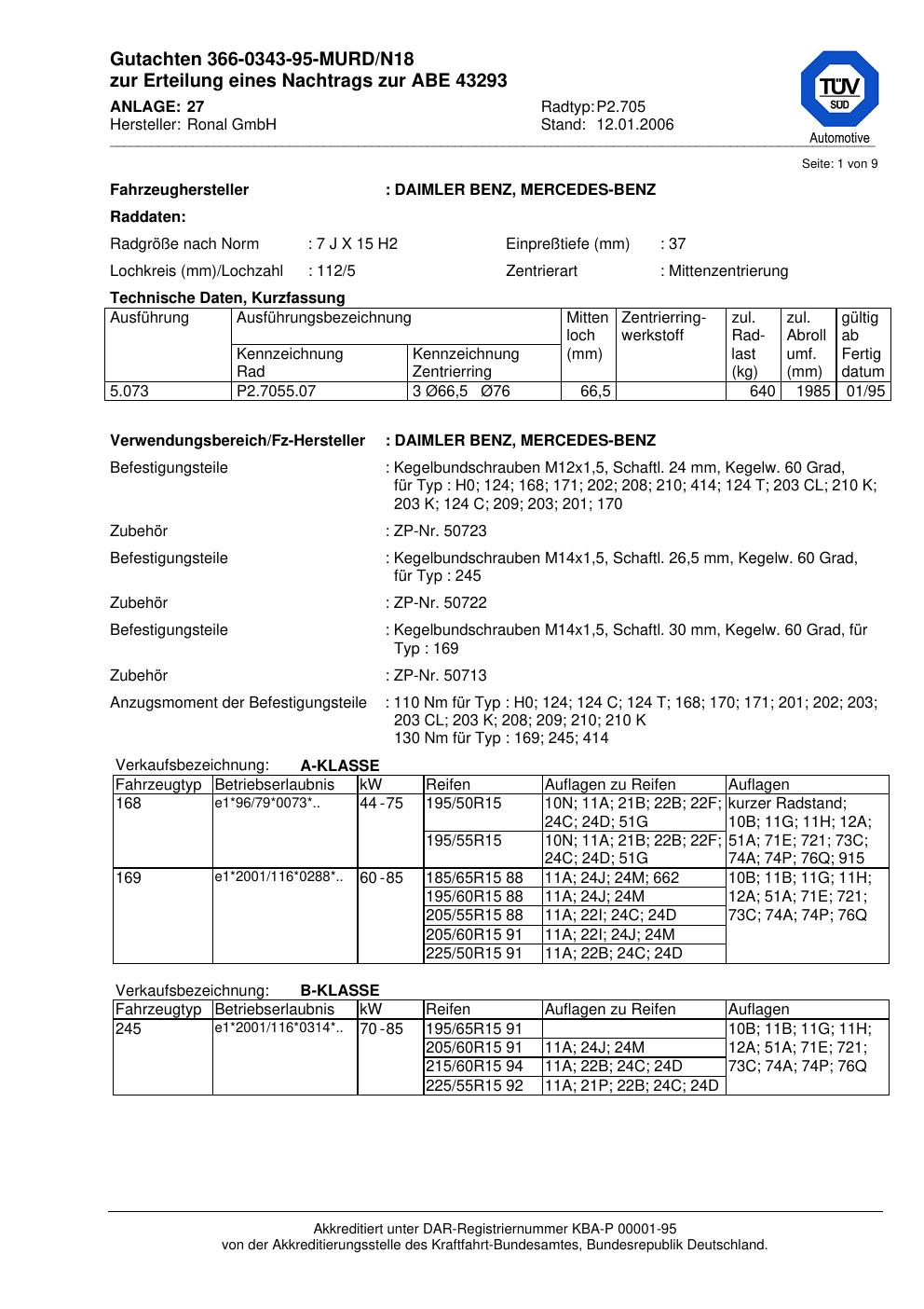 Dieses Gutachten (abe) bezieht sich auf die Alufelge Ronal P2.705 in der Ausführung 7Jx15 ET 0, Mittenloch 0 mm (KBA 43293). Im PDF findest du typischerweise zulässige Reifengrößen, Auflagen/Anbauhinweise und – je nach Dokument – Hinweise zur Eintragung.