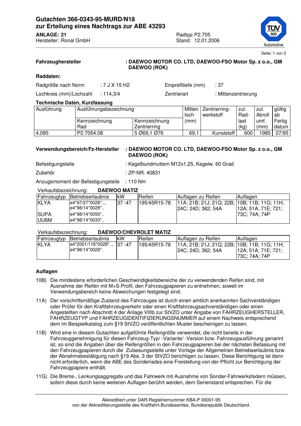 Dieses Gutachten (abe) bezieht sich auf die Alufelge Ronal P2.705 in der Ausführung 7Jx15 ET 0, Mittenloch 0 mm (KBA 43293). Im PDF findest du typischerweise zulässige Reifengrößen, Auflagen/Anbauhinweise und – je nach Dokument – Hinweise zur Eintragung.