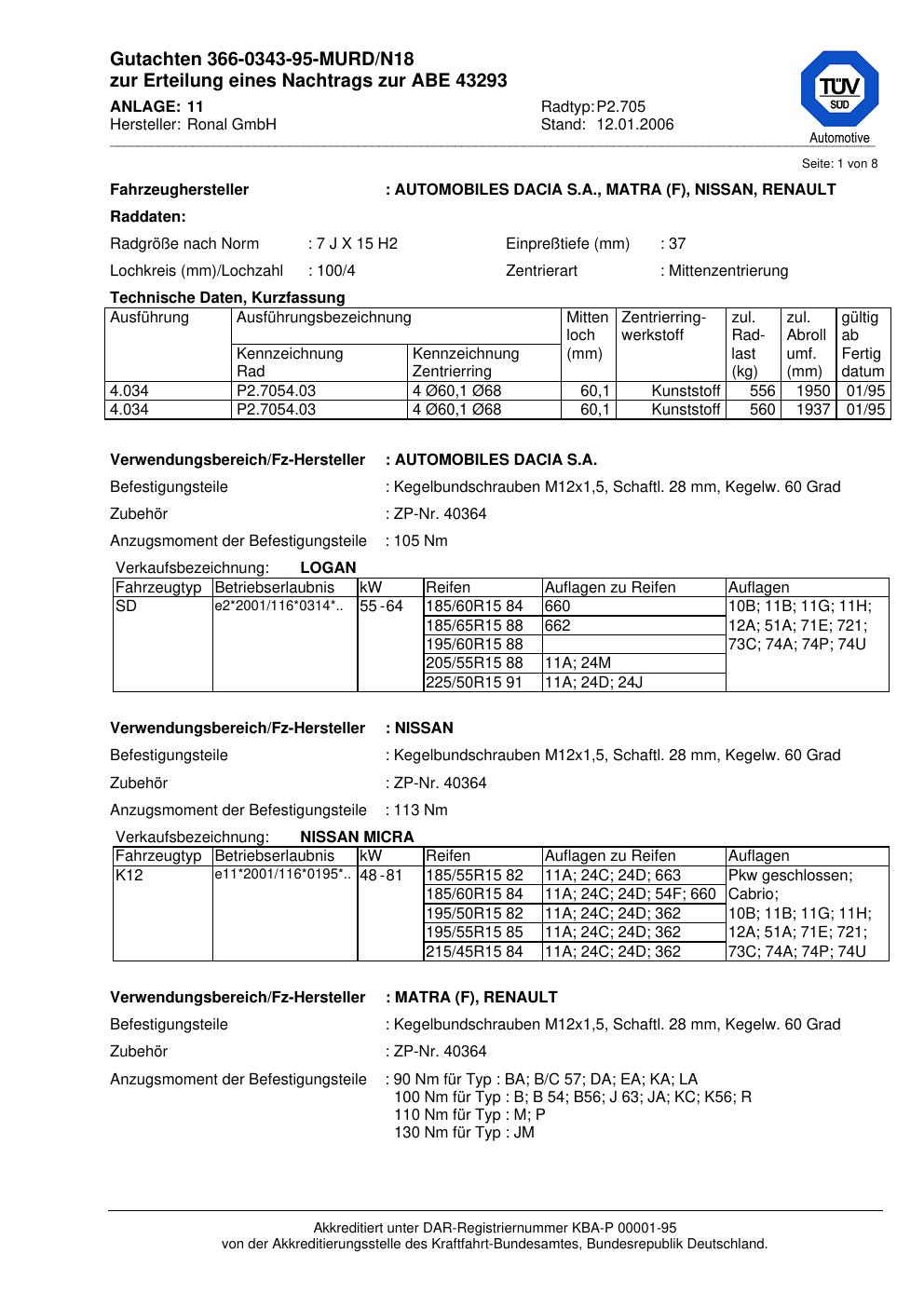 Dieses Gutachten (abe) bezieht sich auf die Alufelge Ronal P2.705 in der Ausführung 7Jx15 ET 0, Mittenloch 0 mm (KBA 43293). Im PDF findest du typischerweise zulässige Reifengrößen, Auflagen/Anbauhinweise und – je nach Dokument – Hinweise zur Eintragung.