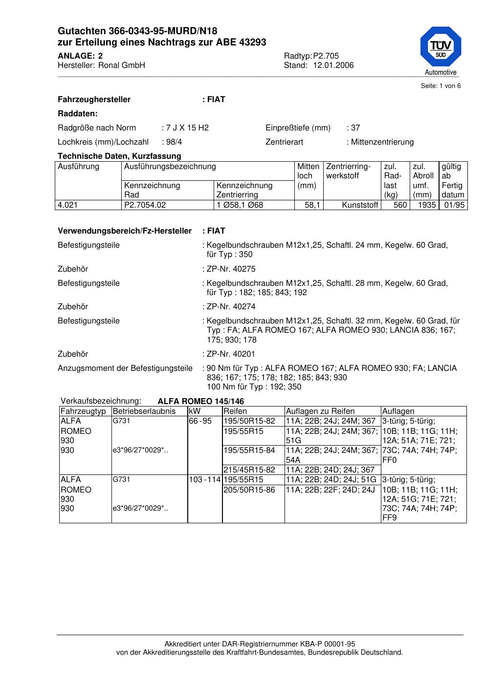 Felgengutachten / abe für Alufelgen Ronal P2.705 (7Jx15 ET 0, Mittenloch 0 mm) mit KBA 43293 (Zertifikatsnummer 43293). Hier kostenlos als PDF herunterladen. Der Download-Link ist 24 Stunden gültig und kann bis zu zwei Mal verwendet werden.