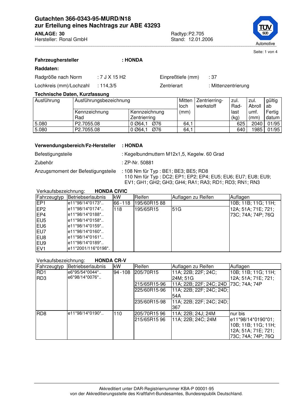 Dieses Gutachten (abe) bezieht sich auf die Alufelge Ronal P2.705 in der Ausführung 7Jx15 ET 0, Mittenloch 0 mm (KBA 43293). Im PDF findest du typischerweise zulässige Reifengrößen, Auflagen/Anbauhinweise und – je nach Dokument – Hinweise zur Eintragung.