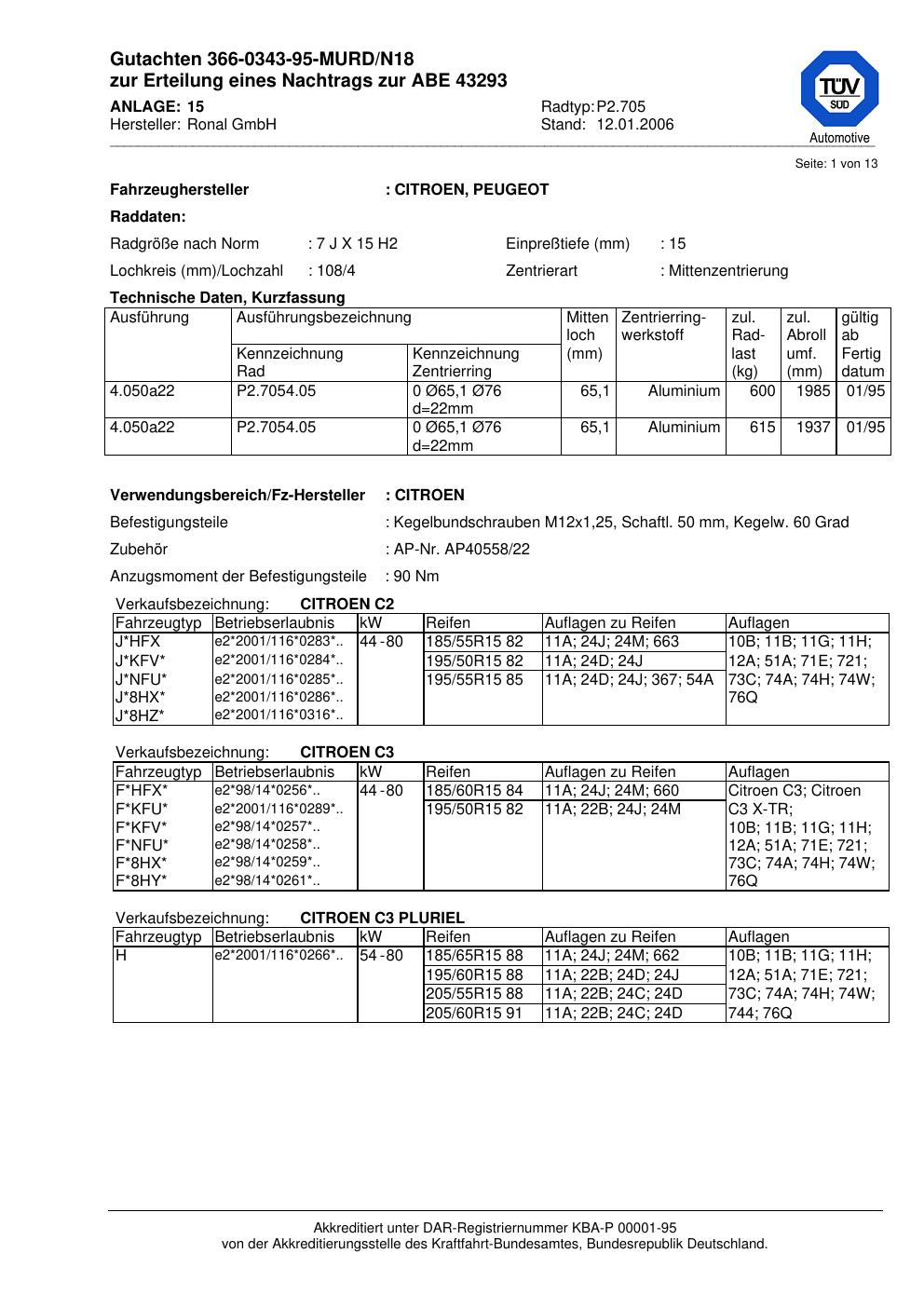 Dieses Gutachten (abe) bezieht sich auf die Alufelge brand-ronal P2.705 in der Ausführung 7Jx15 ET 0, Mittenloch 0 mm (KBA 43293). Im PDF findest du typischerweise zulässige Reifengrößen, Auflagen/Anbauhinweise und – je nach Dokument – Hinweise zur Eintragung.