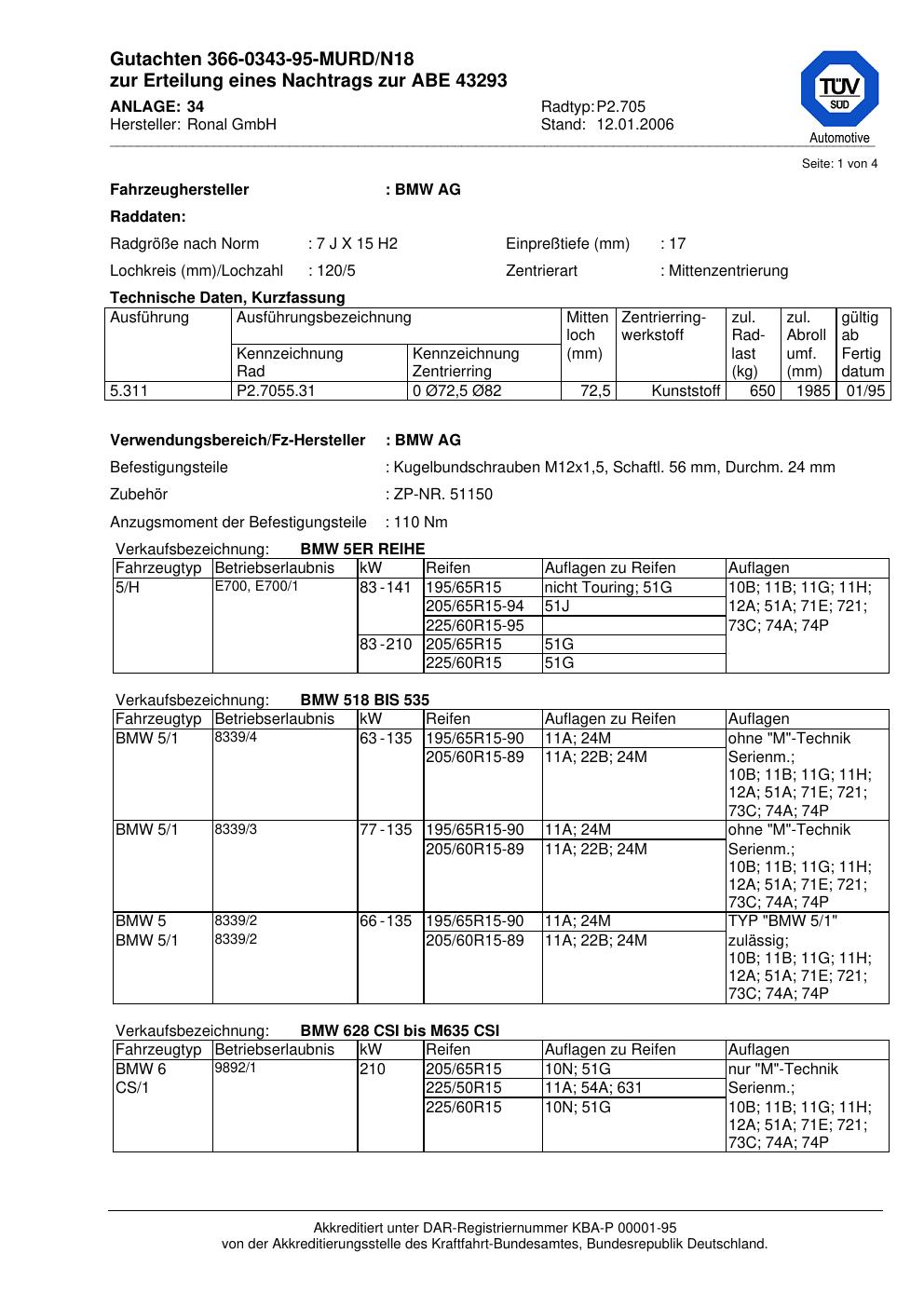 Felgengutachten / abe für Alufelgen Ronal P2.705 (7Jx15 ET 0, Mittenloch 0 mm) mit KBA 43293 (Zertifikatsnummer 43293). Hier kostenlos als PDF herunterladen. Der Download-Link ist 24 Stunden gültig und kann bis zu zwei Mal verwendet werden.