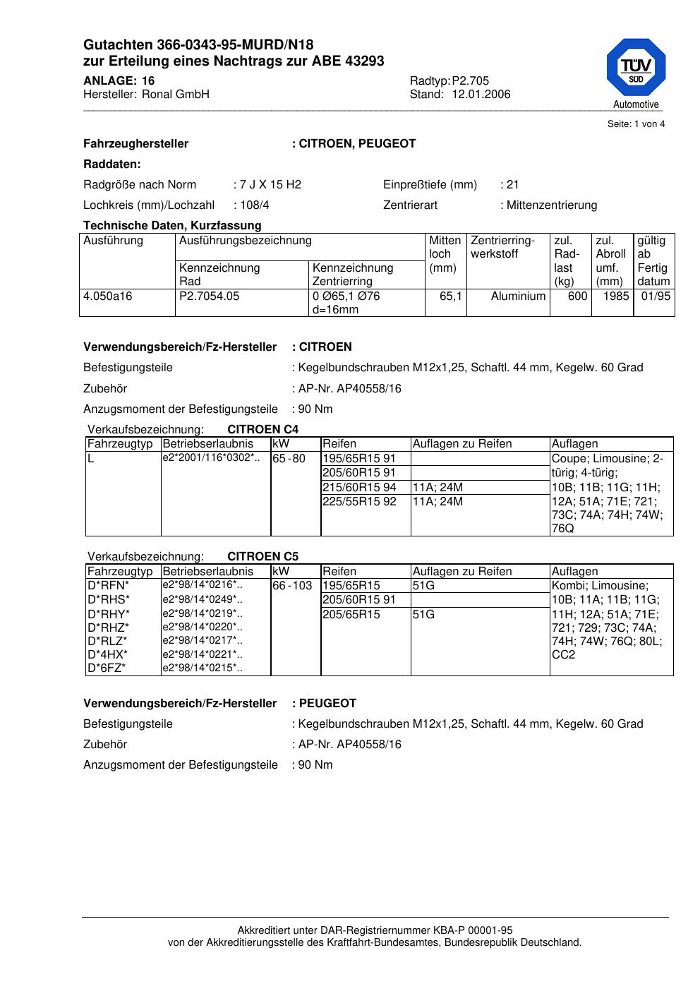Dieses Gutachten (abe) bezieht sich auf die Alufelge brand-ronal P2.705 in der Ausführung 7Jx15 ET 0, Mittenloch 0 mm (KBA 43293). Im PDF findest du typischerweise zulässige Reifengrößen, Auflagen/Anbauhinweise und – je nach Dokument – Hinweise zur Eintragung.