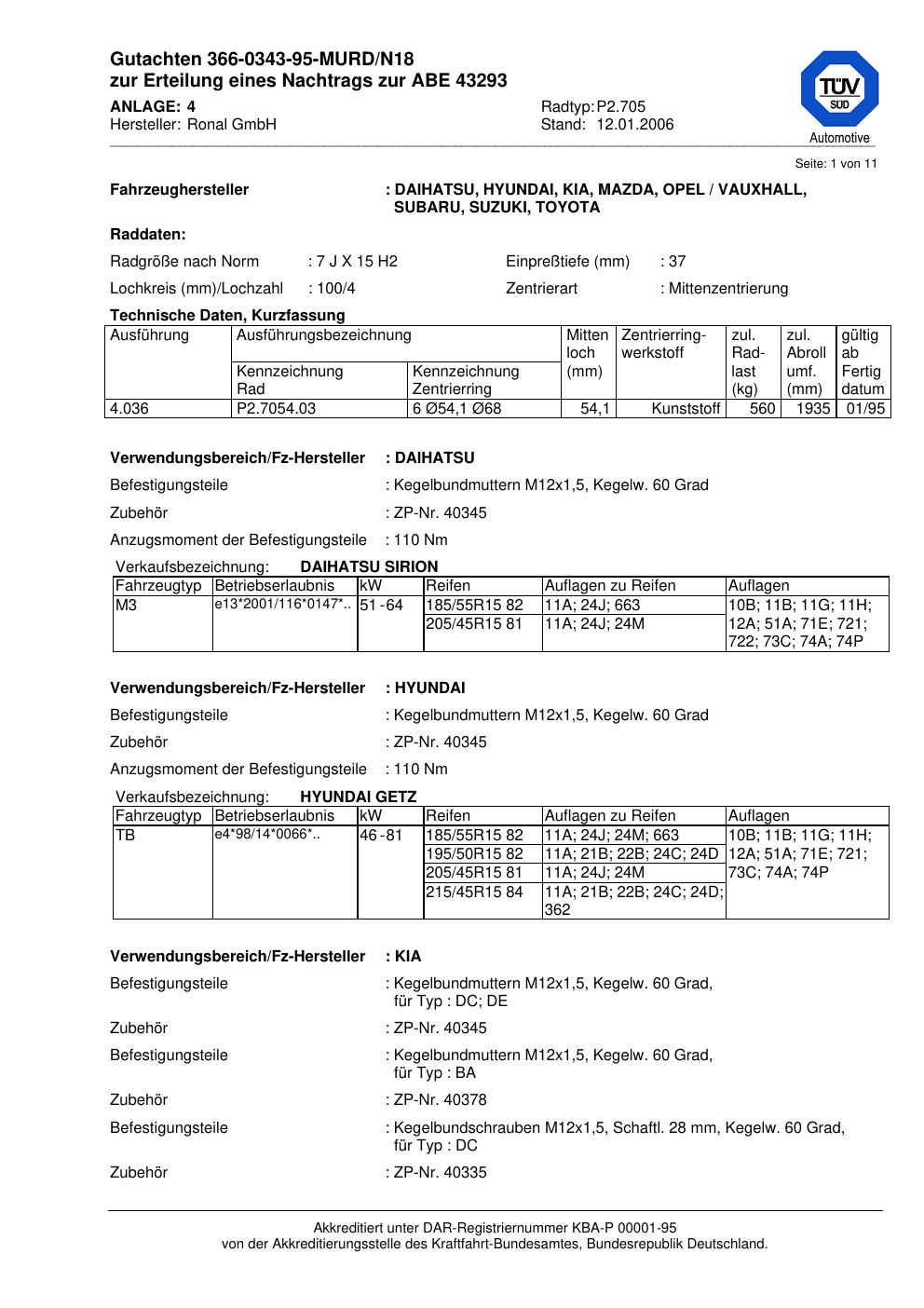 Dieses Gutachten (abe) bezieht sich auf die Alufelge Ronal P2.705 in der Ausführung 7Jx15 ET 0, Mittenloch 0 mm (KBA 43293). Im PDF findest du typischerweise zulässige Reifengrößen, Auflagen/Anbauhinweise und – je nach Dokument – Hinweise zur Eintragung.
