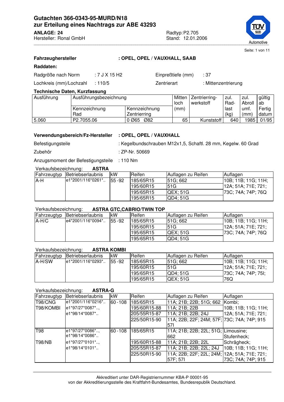 Dieses Gutachten (abe) bezieht sich auf die Alufelge Ronal P2.705 in der Ausführung 7Jx15 ET 0, Mittenloch 0 mm (KBA 43293). Im PDF findest du typischerweise zulässige Reifengrößen, Auflagen/Anbauhinweise und – je nach Dokument – Hinweise zur Eintragung.