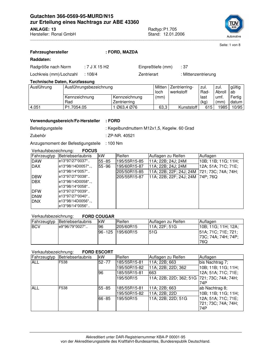 Dieses Gutachten (abe) bezieht sich auf die Alufelge Ronal P1.705 in der Ausführung 7Jx15 ET 0, Mittenloch 0 mm (KBA 43360). Im PDF findest du typischerweise zulässige Reifengrößen, Auflagen/Anbauhinweise und – je nach Dokument – Hinweise zur Eintragung.