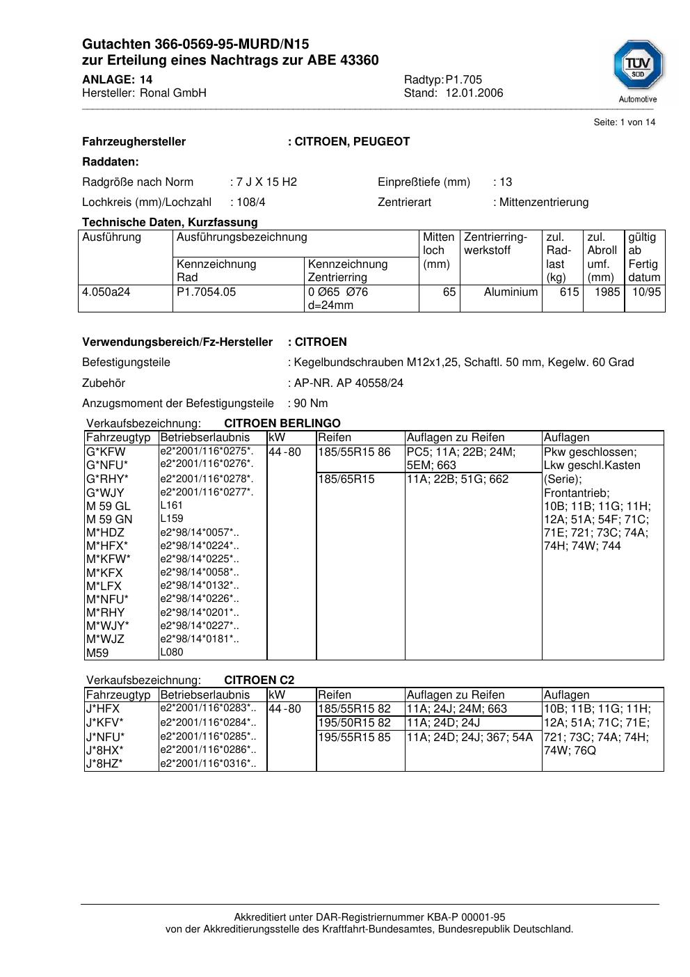 Dieses Gutachten (abe) bezieht sich auf die Alufelge brand-ronal P1.705 in der Ausführung 7Jx15 ET 0, Mittenloch 0 mm (KBA 43360). Im PDF findest du typischerweise zulässige Reifengrößen, Auflagen/Anbauhinweise und – je nach Dokument – Hinweise zur Eintragung.