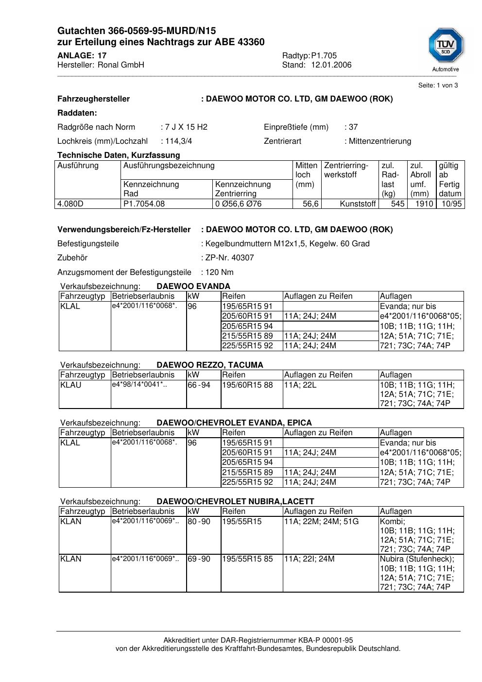 Dieses Gutachten (abe) bezieht sich auf die Alufelge Ronal P1.705 in der Ausführung 7Jx15 ET 0, Mittenloch 0 mm (KBA 43360). Im PDF findest du typischerweise zulässige Reifengrößen, Auflagen/Anbauhinweise und – je nach Dokument – Hinweise zur Eintragung.