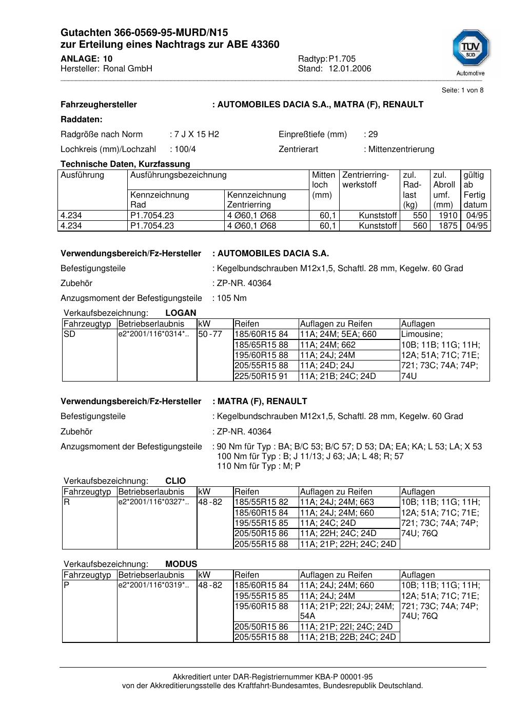 Dieses Gutachten (abe) bezieht sich auf die Alufelge Ronal P1.705 in der Ausführung 7Jx15 ET 0, Mittenloch 0 mm (KBA 43360). Im PDF findest du typischerweise zulässige Reifengrößen, Auflagen/Anbauhinweise und – je nach Dokument – Hinweise zur Eintragung.