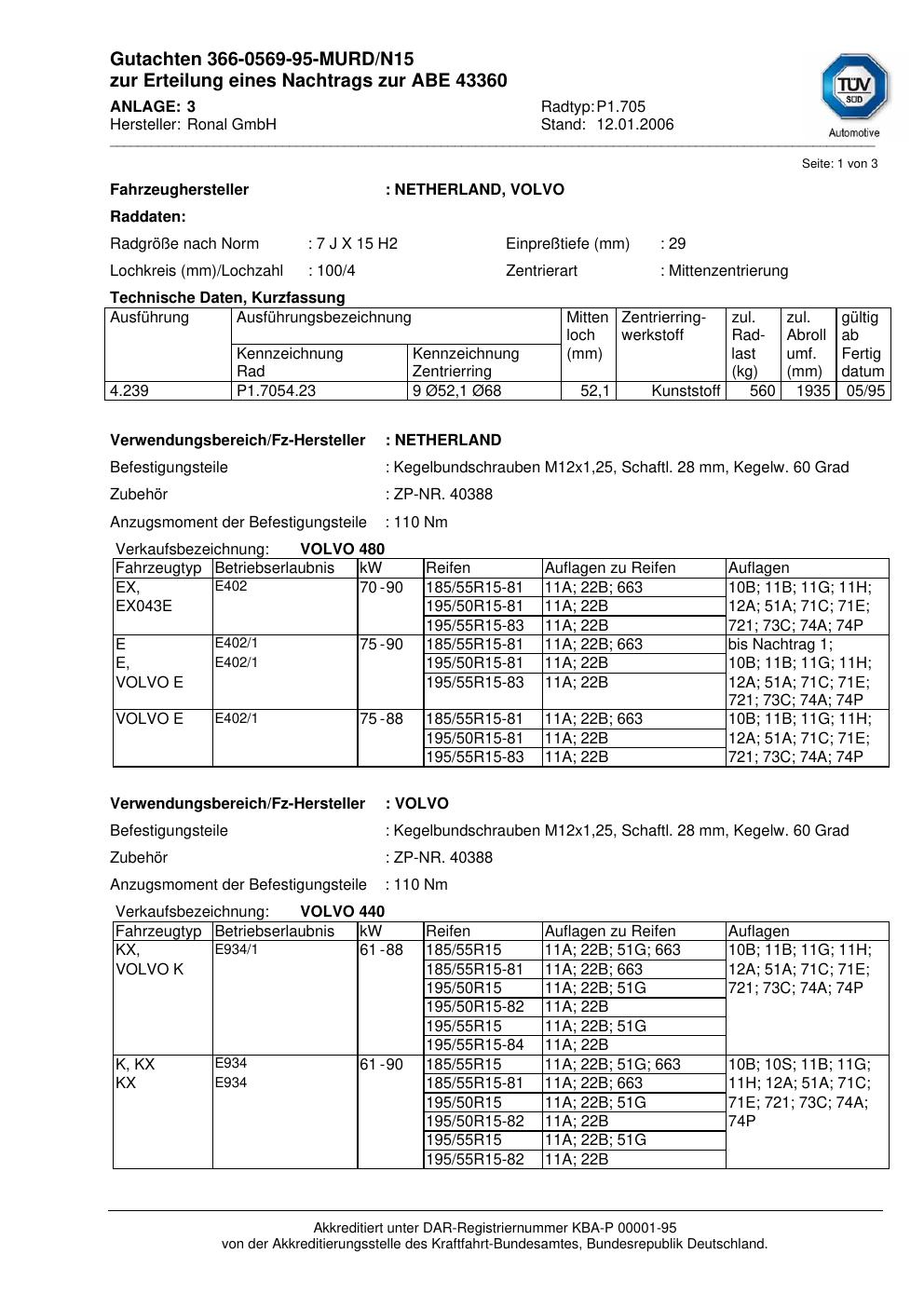 Dieses Gutachten (abe) bezieht sich auf die Alufelge Ronal P1.705 in der Ausführung 7Jx15 ET 0, Mittenloch 0 mm (KBA 43360). Im PDF findest du typischerweise zulässige Reifengrößen, Auflagen/Anbauhinweise und – je nach Dokument – Hinweise zur Eintragung.