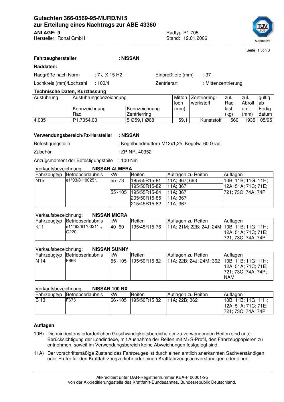 Dieses Gutachten (abe) bezieht sich auf die Alufelge Ronal P1.705 in der Ausführung 7Jx15 ET 0, Mittenloch 0 mm (KBA 43360). Im PDF findest du typischerweise zulässige Reifengrößen, Auflagen/Anbauhinweise und – je nach Dokument – Hinweise zur Eintragung.