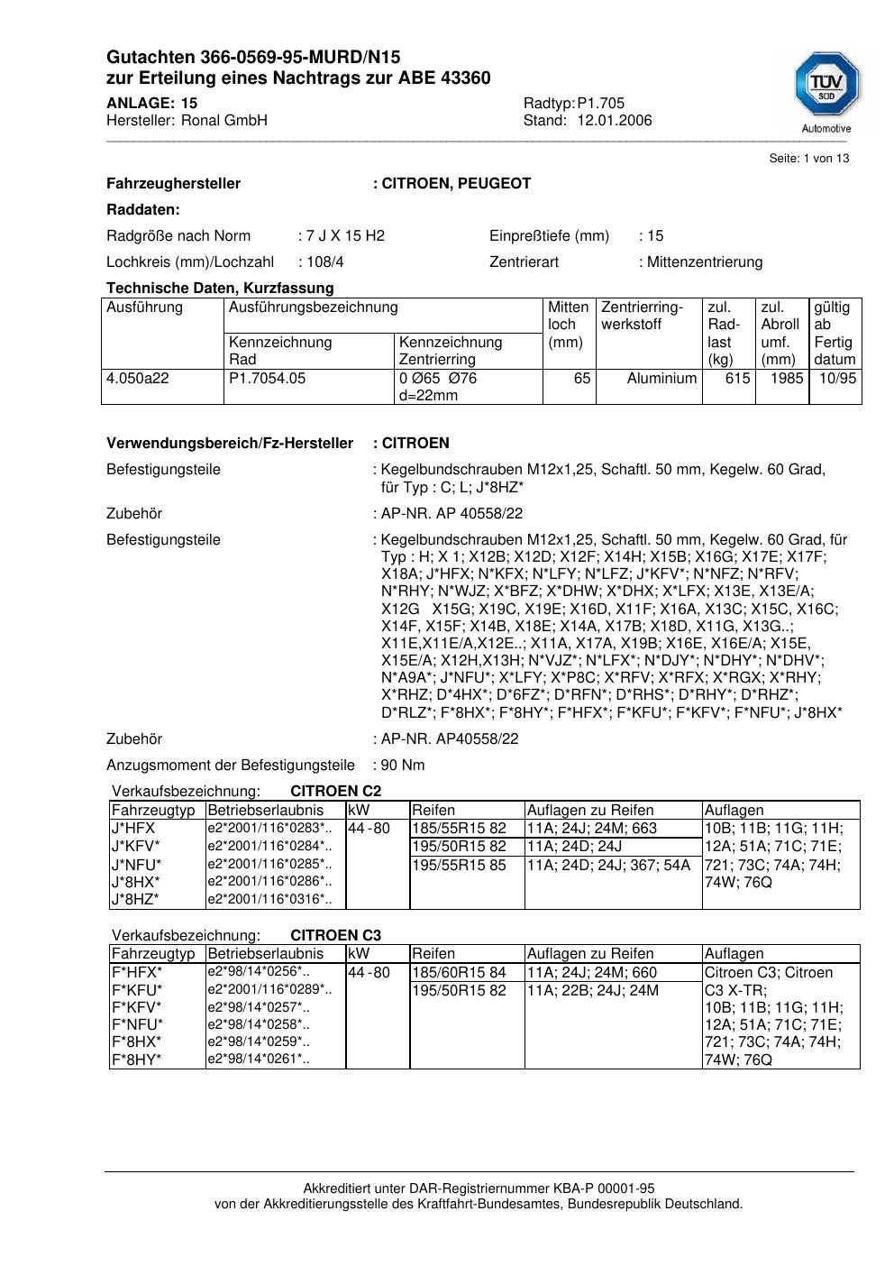 Dieses Gutachten (abe) bezieht sich auf die Alufelge brand-ronal P1.705 in der Ausführung 7Jx15 ET 0, Mittenloch 0 mm (KBA 43360). Im PDF findest du typischerweise zulässige Reifengrößen, Auflagen/Anbauhinweise und – je nach Dokument – Hinweise zur Eintragung.