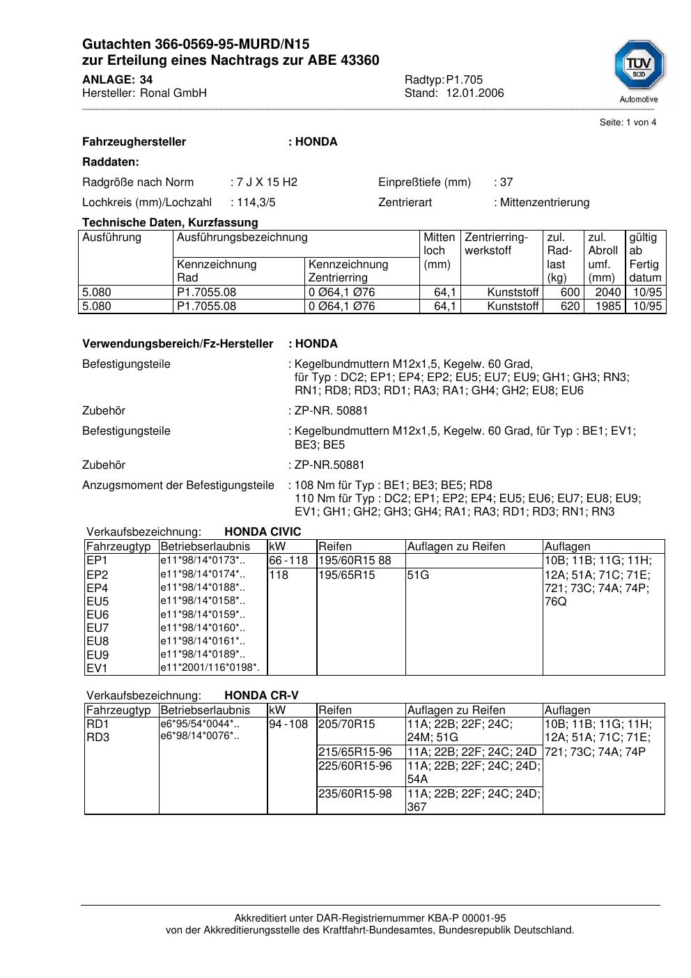 Dieses Gutachten (abe) bezieht sich auf die Alufelge Ronal P1.705 in der Ausführung 7Jx15 ET 0, Mittenloch 0 mm (KBA 43360). Im PDF findest du typischerweise zulässige Reifengrößen, Auflagen/Anbauhinweise und – je nach Dokument – Hinweise zur Eintragung.