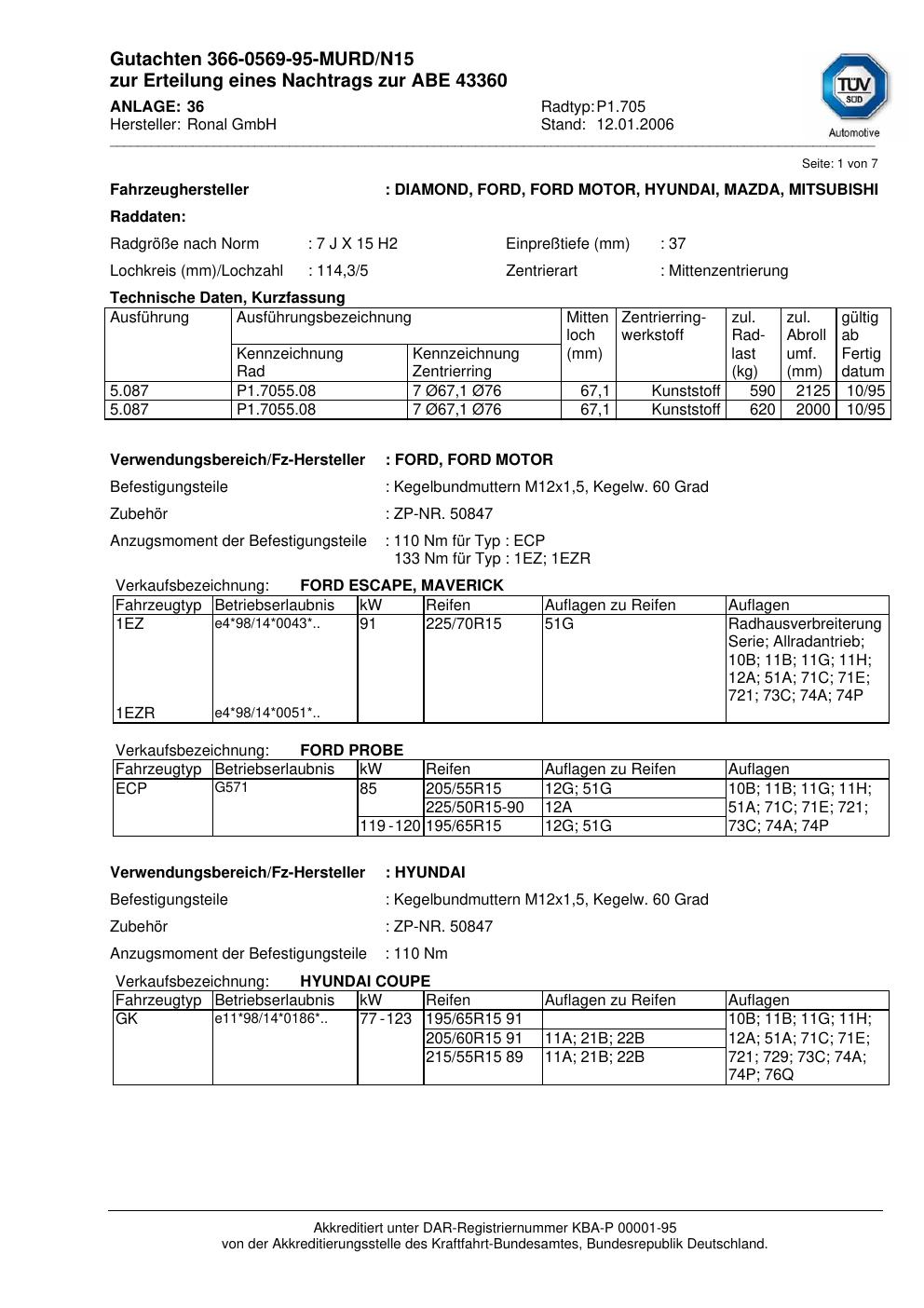 Dieses Gutachten (abe) bezieht sich auf die Alufelge Ronal P1.705 in der Ausführung 7Jx15 ET 0, Mittenloch 0 mm (KBA 43360). Im PDF findest du typischerweise zulässige Reifengrößen, Auflagen/Anbauhinweise und – je nach Dokument – Hinweise zur Eintragung.