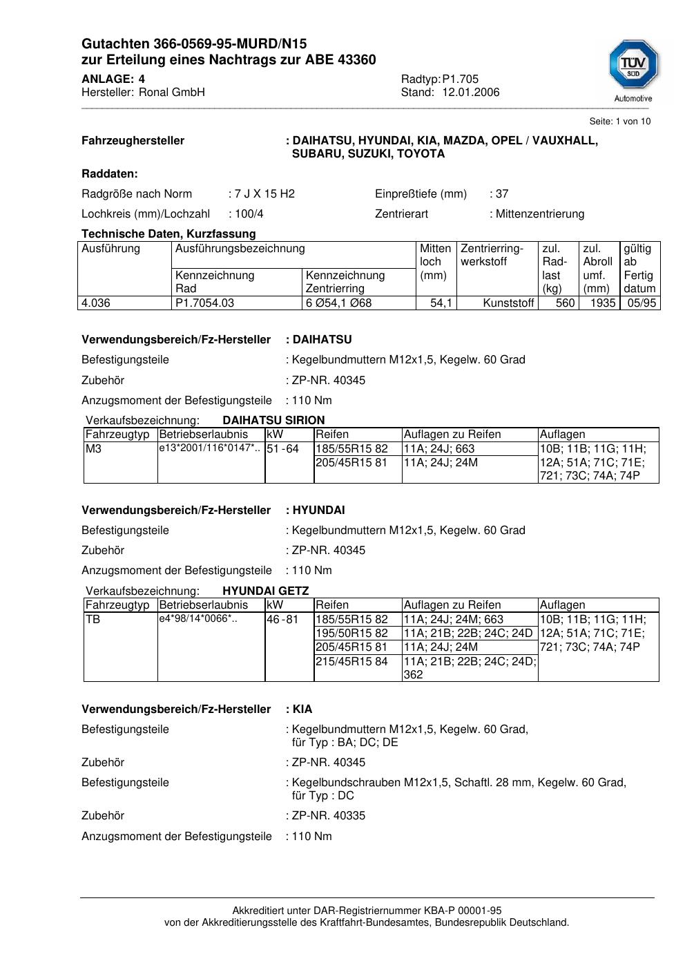 Dieses Gutachten (abe) bezieht sich auf die Alufelge Ronal P1.705 in der Ausführung 7Jx15 ET 0, Mittenloch 0 mm (KBA 43360). Im PDF findest du typischerweise zulässige Reifengrößen, Auflagen/Anbauhinweise und – je nach Dokument – Hinweise zur Eintragung.
