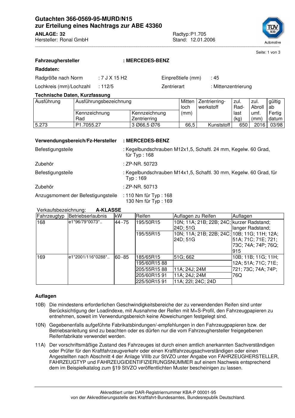 Dieses Gutachten (abe) bezieht sich auf die Alufelge Ronal P1.705 in der Ausführung 7Jx15 ET 0, Mittenloch 0 mm (KBA 43360). Im PDF findest du typischerweise zulässige Reifengrößen, Auflagen/Anbauhinweise und – je nach Dokument – Hinweise zur Eintragung.