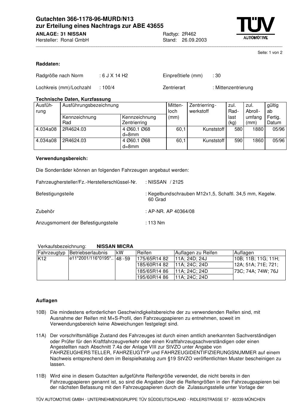 Dieses Gutachten (abe) bezieht sich auf die Alufelge Ronal 2R462 in der Ausführung 6Jx14 ET 0, Mittenloch 0 mm (KBA 43655). Im PDF findest du typischerweise zulässige Reifengrößen, Auflagen/Anbauhinweise und – je nach Dokument – Hinweise zur Eintragung.