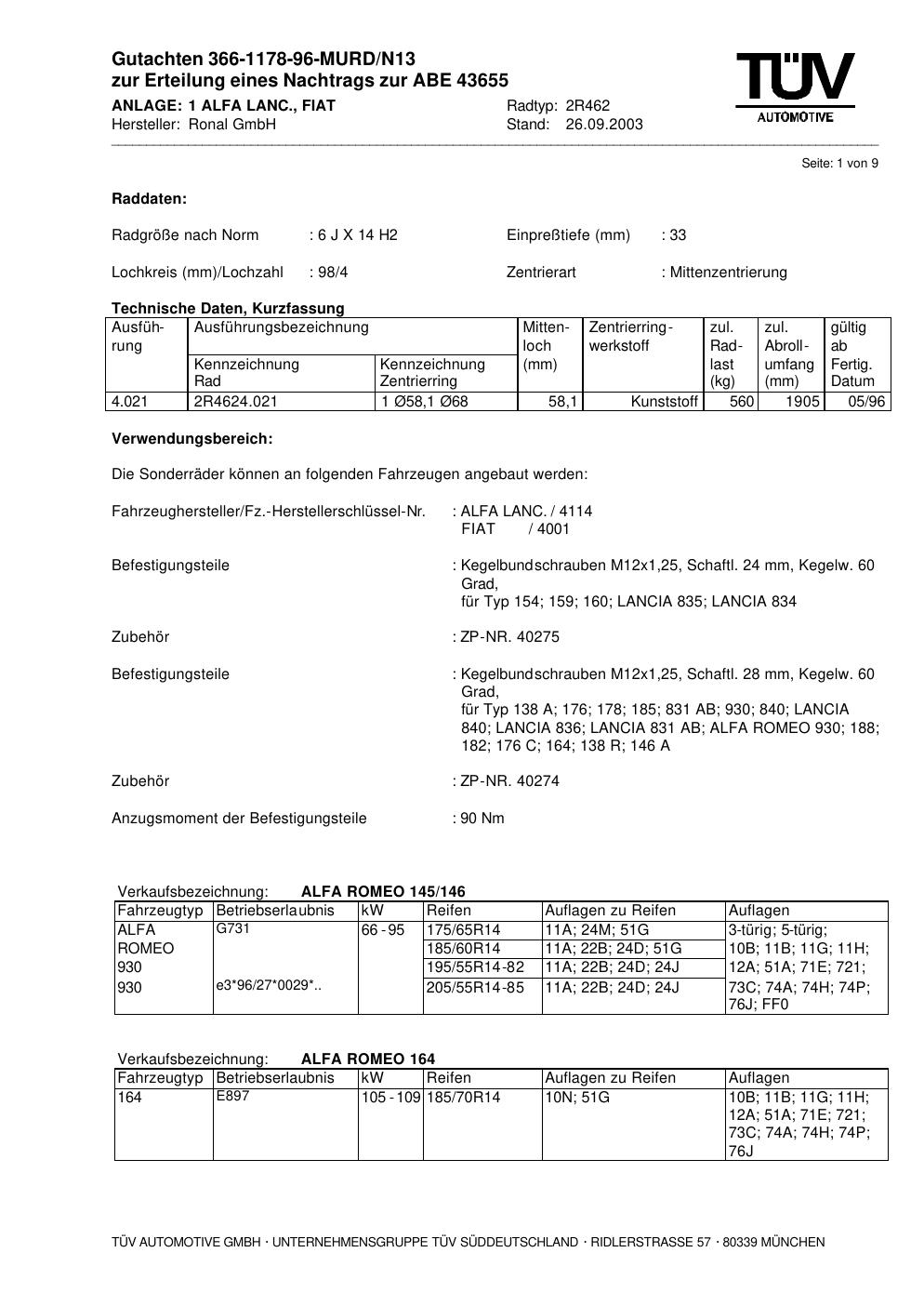 Dieses Gutachten (abe) bezieht sich auf die Alufelge Ronal 2R462 in der Ausführung 6Jx14 ET 0, Mittenloch 0 mm (KBA 43655). Im PDF findest du typischerweise zulässige Reifengrößen, Auflagen/Anbauhinweise und – je nach Dokument – Hinweise zur Eintragung.