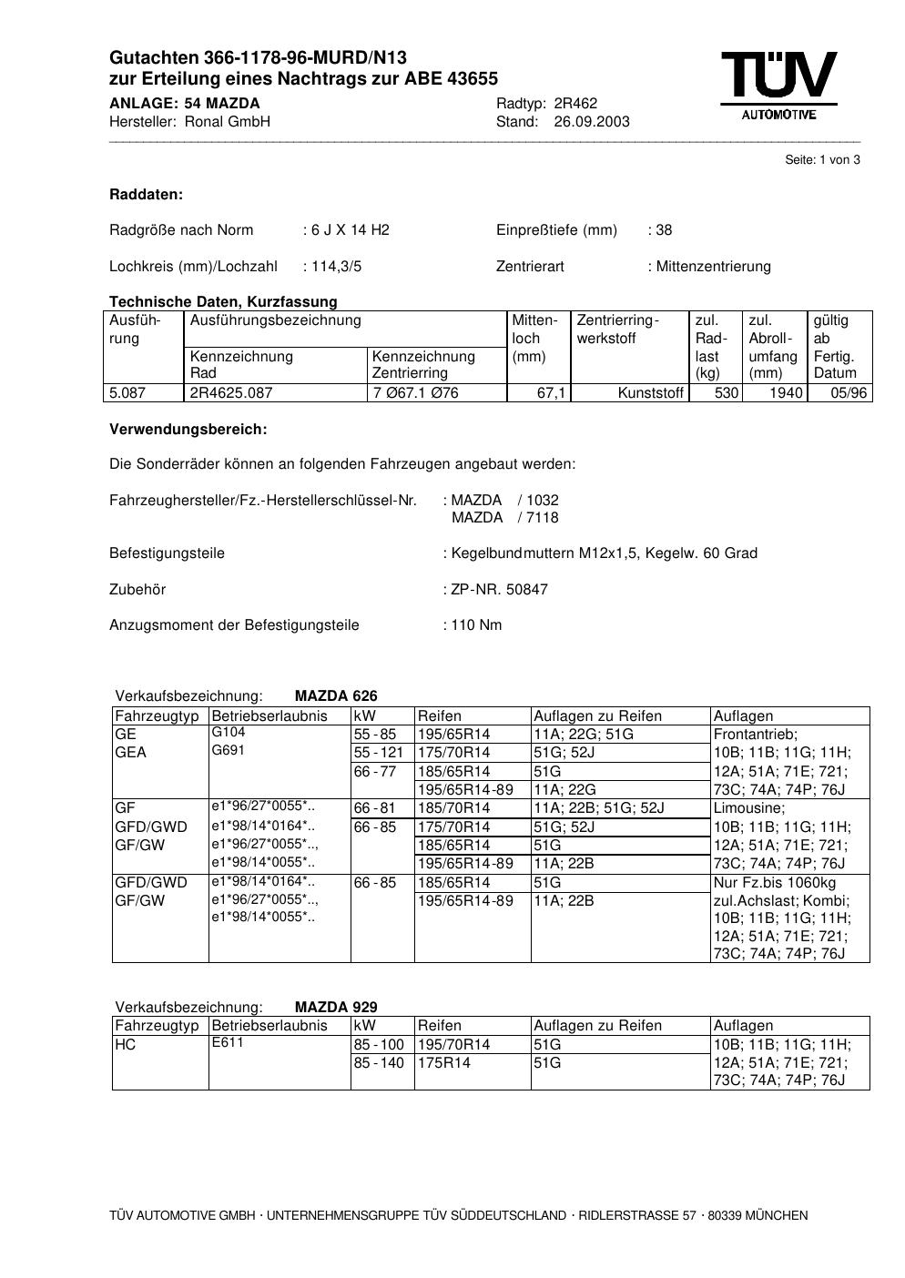 Dieses Gutachten (abe) bezieht sich auf die Alufelge Ronal 2R462 in der Ausführung 6Jx14 ET 0, Mittenloch 0 mm (KBA 43655). Im PDF findest du typischerweise zulässige Reifengrößen, Auflagen/Anbauhinweise und – je nach Dokument – Hinweise zur Eintragung.