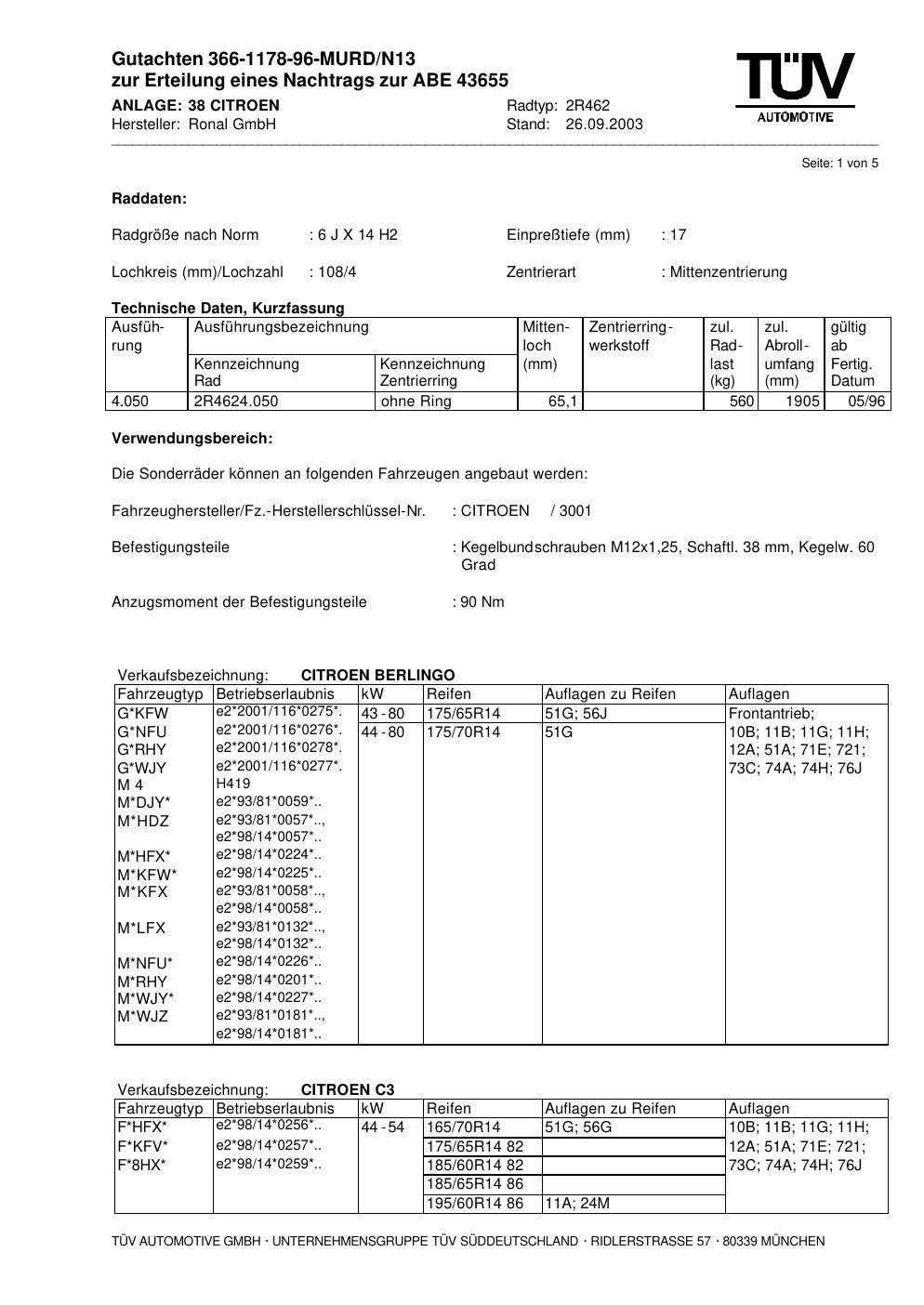 Dieses Gutachten (abe) bezieht sich auf die Alufelge Ronal 2R462 in der Ausführung 6Jx14 ET 0, Mittenloch 0 mm (KBA 43655). Im PDF findest du typischerweise zulässige Reifengrößen, Auflagen/Anbauhinweise und – je nach Dokument – Hinweise zur Eintragung.