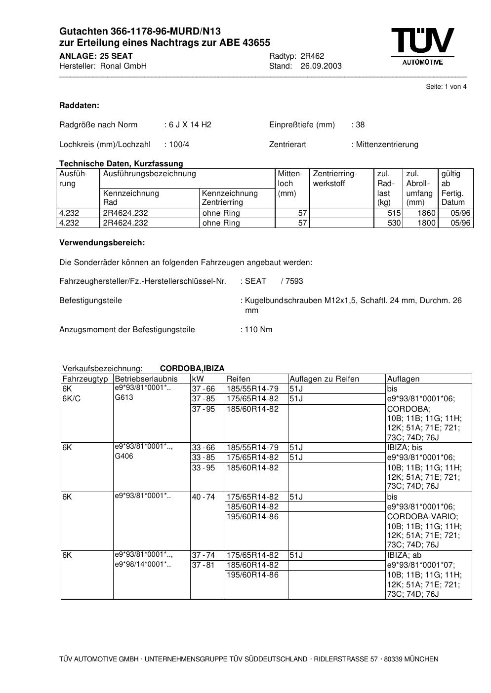 Dieses Gutachten (abe) bezieht sich auf die Alufelge Ronal 2R462 in der Ausführung 6Jx14 ET 0, Mittenloch 0 mm (KBA 43655). Im PDF findest du typischerweise zulässige Reifengrößen, Auflagen/Anbauhinweise und – je nach Dokument – Hinweise zur Eintragung.