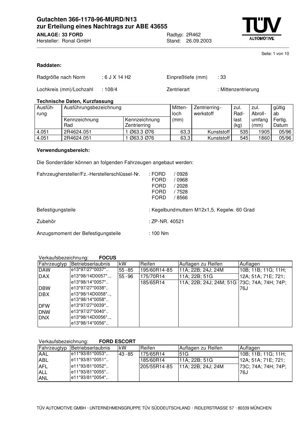 Dieses Gutachten (abe) bezieht sich auf die Alufelge Ronal 2R462 in der Ausführung 6Jx14 ET 0, Mittenloch 0 mm (KBA 43655). Im PDF findest du typischerweise zulässige Reifengrößen, Auflagen/Anbauhinweise und – je nach Dokument – Hinweise zur Eintragung.