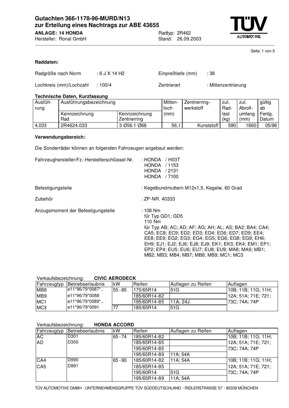 Dieses Gutachten (abe) bezieht sich auf die Alufelge Ronal 2R462 in der Ausführung 6Jx14 ET 0, Mittenloch 0 mm (KBA 43655). Im PDF findest du typischerweise zulässige Reifengrößen, Auflagen/Anbauhinweise und – je nach Dokument – Hinweise zur Eintragung.