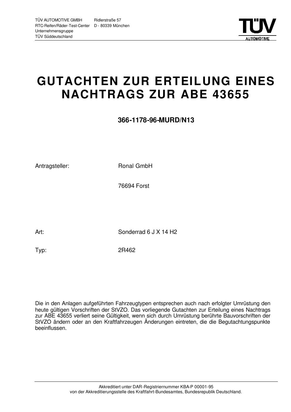 Dieses Gutachten (abe) bezieht sich auf die Alufelge Ronal 2R462 in der Ausführung 6Jx14 ET 0, Mittenloch 0 mm (KBA 43655). Im PDF findest du typischerweise zulässige Reifengrößen, Auflagen/Anbauhinweise und – je nach Dokument – Hinweise zur Eintragung.