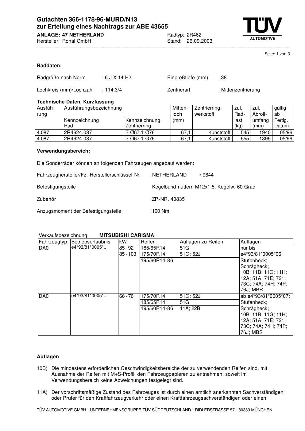 Dieses Gutachten (abe) bezieht sich auf die Alufelge Ronal 2R462 in der Ausführung 6Jx14 ET 0, Mittenloch 0 mm (KBA 43655). Im PDF findest du typischerweise zulässige Reifengrößen, Auflagen/Anbauhinweise und – je nach Dokument – Hinweise zur Eintragung.