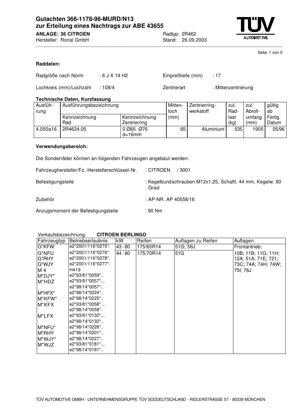 Dieses Gutachten (abe) bezieht sich auf die Alufelge brand-ronal 2R462 in der Ausführung 6Jx14 ET 0, Mittenloch 0 mm (KBA 43655). Im PDF findest du typischerweise zulässige Reifengrößen, Auflagen/Anbauhinweise und – je nach Dokument – Hinweise zur Eintragung.