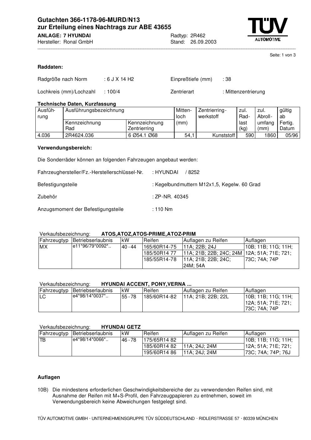 Dieses Gutachten (abe) bezieht sich auf die Alufelge Ronal 2R462 in der Ausführung 6Jx14 ET 0, Mittenloch 0 mm (KBA 43655). Im PDF findest du typischerweise zulässige Reifengrößen, Auflagen/Anbauhinweise und – je nach Dokument – Hinweise zur Eintragung.
