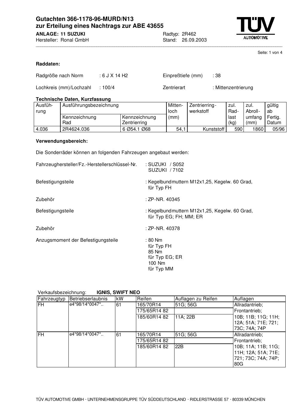Dieses Gutachten (abe) bezieht sich auf die Alufelge Ronal 2R462 in der Ausführung 6Jx14 ET 0, Mittenloch 0 mm (KBA 43655). Im PDF findest du typischerweise zulässige Reifengrößen, Auflagen/Anbauhinweise und – je nach Dokument – Hinweise zur Eintragung.