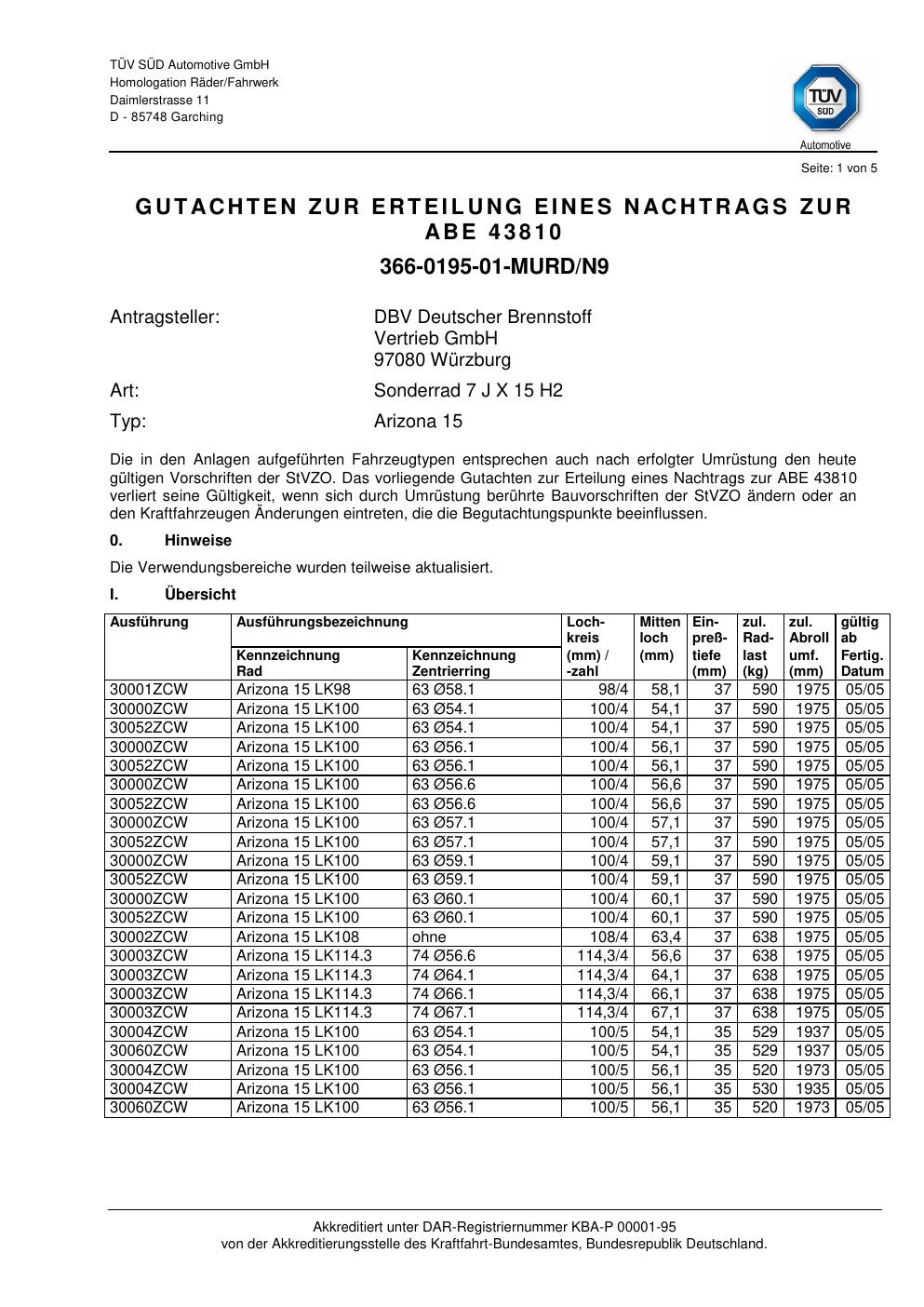 Dieses Gutachten (abe) bezieht sich auf die Alufelge ATS Arizona 15 in der Ausführung 7Jx15 ET 0, Mittenloch 0 mm (KBA 43810). Im PDF findest du typischerweise zulässige Reifengrößen, Auflagen/Anbauhinweise und – je nach Dokument – Hinweise zur Eintragung.