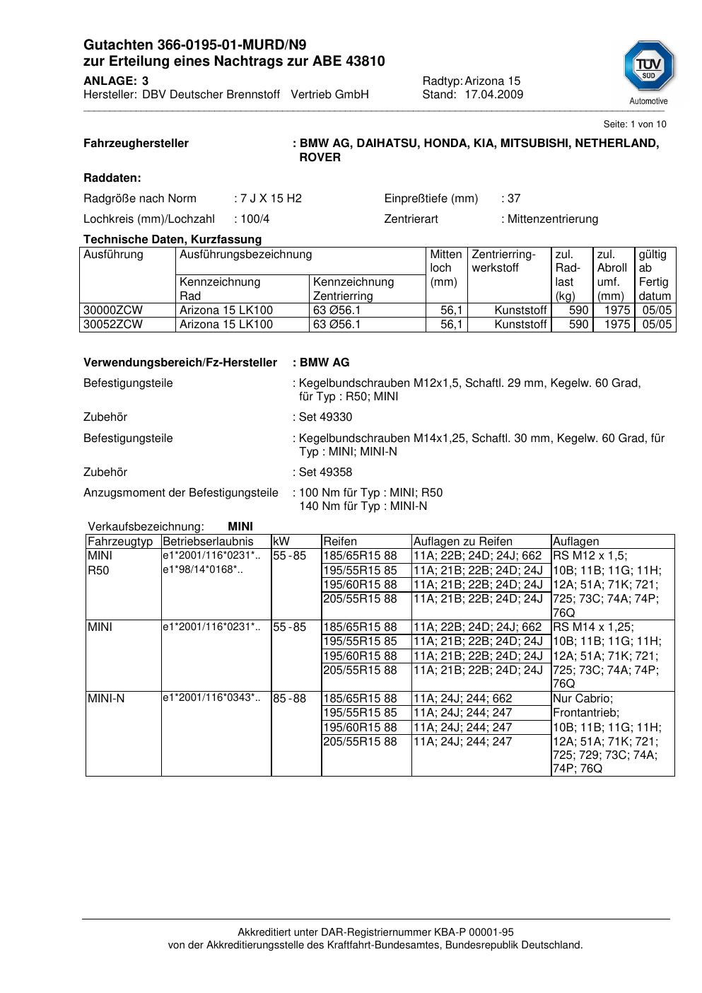 Dieses Gutachten (abe) bezieht sich auf die Alufelge ATS Arizona 15 in der Ausführung 7Jx15 ET 0, Mittenloch 0 mm (KBA 43810). Im PDF findest du typischerweise zulässige Reifengrößen, Auflagen/Anbauhinweise und – je nach Dokument – Hinweise zur Eintragung.