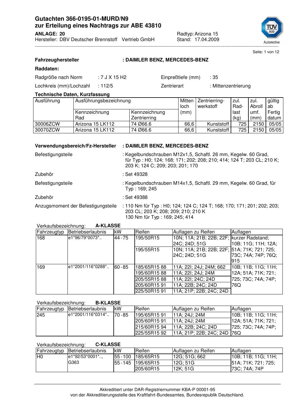 Dieses Gutachten (abe) bezieht sich auf die Alufelge ATS Arizona 15 in der Ausführung 7Jx15 ET 0, Mittenloch 0 mm (KBA 43810). Im PDF findest du typischerweise zulässige Reifengrößen, Auflagen/Anbauhinweise und – je nach Dokument – Hinweise zur Eintragung.