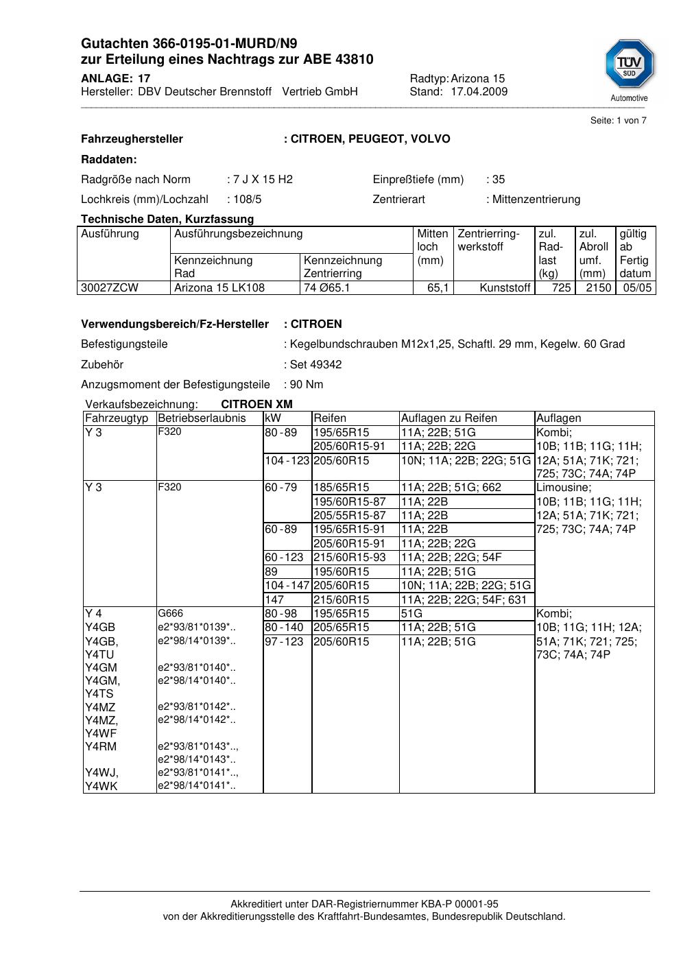 Dieses Gutachten (abe) bezieht sich auf die Alufelge ATS Arizona 15 in der Ausführung 7Jx15 ET 0, Mittenloch 0 mm (KBA 43810). Im PDF findest du typischerweise zulässige Reifengrößen, Auflagen/Anbauhinweise und – je nach Dokument – Hinweise zur Eintragung.