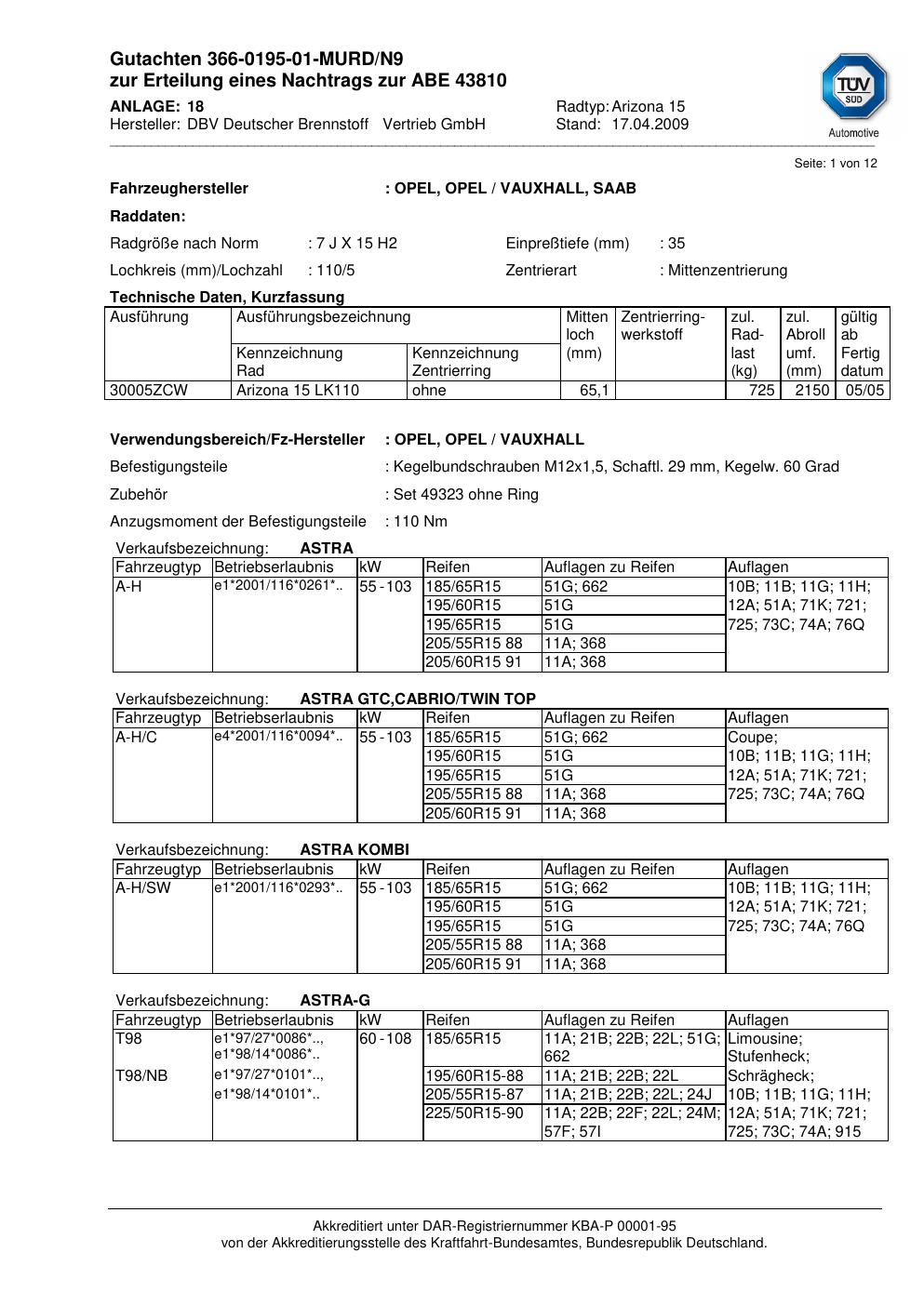 Dieses Gutachten (abe) bezieht sich auf die Alufelge ATS Arizona 15 in der Ausführung 7Jx15 ET 0, Mittenloch 0 mm (KBA 43810). Im PDF findest du typischerweise zulässige Reifengrößen, Auflagen/Anbauhinweise und – je nach Dokument – Hinweise zur Eintragung.