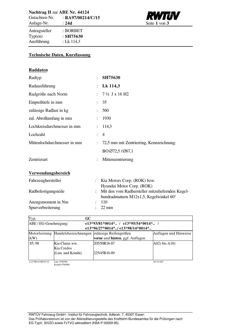 Dieses Gutachten (abe) bezieht sich auf die Alufelge Borbet SH75630 in der Ausführung ET 0, Mittenloch 0 mm (KBA 44124). Im PDF findest du typischerweise zulässige Reifengrößen, Auflagen/Anbauhinweise und – je nach Dokument – Hinweise zur Eintragung.
