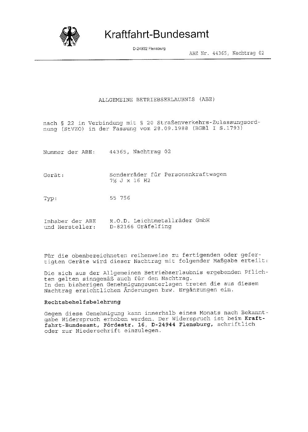 Felgengutachten / abe für Alufelgen Rondell R.O.D. Rod Design 0055 / PKW-Sonderrad 7,5Jx16H2 (ET 0, Mittenloch 0 mm) mit KBA 44365 (Zertifikatsnummer 44365). Hier kostenlos als PDF herunterladen. Der Download-Link ist 24 Stunden gültig und kann bis zu zwei Mal verwendet werden.
