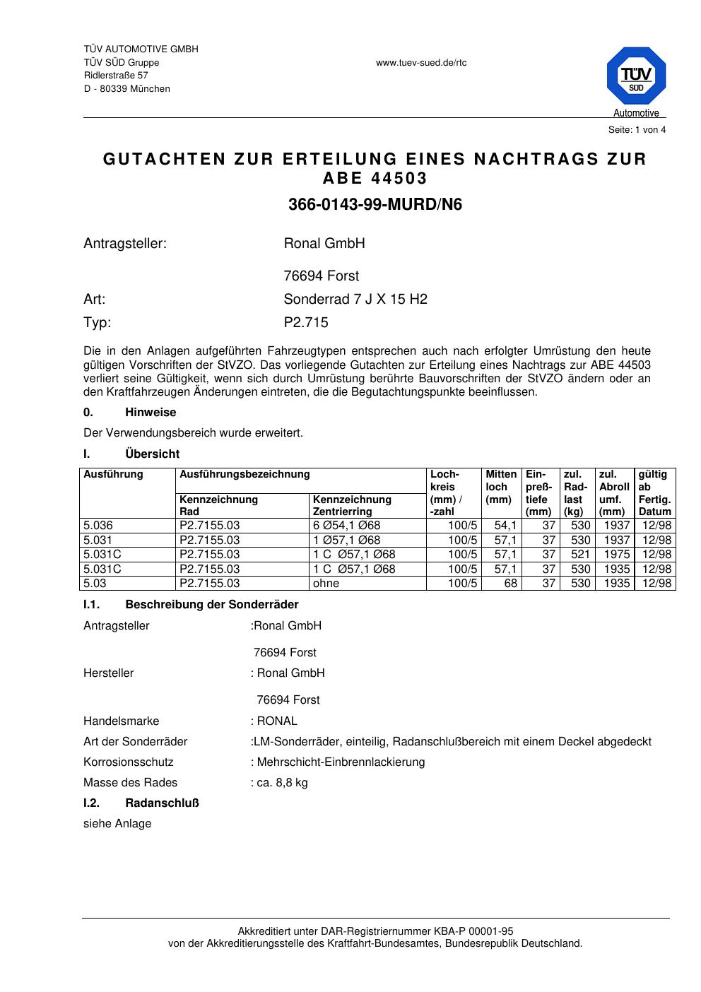 Dieses Gutachten (abe) bezieht sich auf die Alufelge Ronal P2.715 in der Ausführung 7Jx15 ET 0, Mittenloch 0 mm (KBA 44503). Im PDF findest du typischerweise zulässige Reifengrößen, Auflagen/Anbauhinweise und – je nach Dokument – Hinweise zur Eintragung.