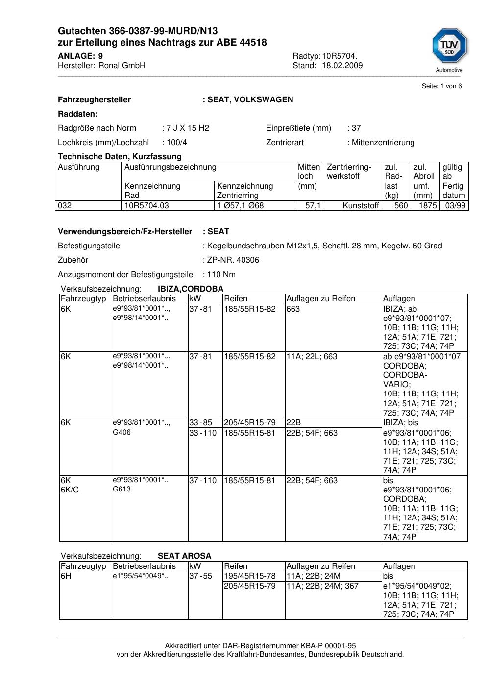 Dieses Gutachten (abe) bezieht sich auf die Alufelge Ronal 10R5704 in der Ausführung 7Jx15 ET 0, Mittenloch 0 mm (KBA 44518). Im PDF findest du typischerweise zulässige Reifengrößen, Auflagen/Anbauhinweise und – je nach Dokument – Hinweise zur Eintragung.