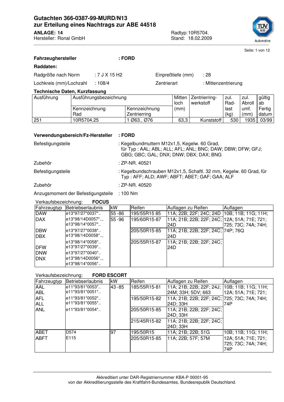 Dieses Gutachten (abe) bezieht sich auf die Alufelge Ronal 10R5704 in der Ausführung 7Jx15 ET 0, Mittenloch 0 mm (KBA 44518). Im PDF findest du typischerweise zulässige Reifengrößen, Auflagen/Anbauhinweise und – je nach Dokument – Hinweise zur Eintragung.