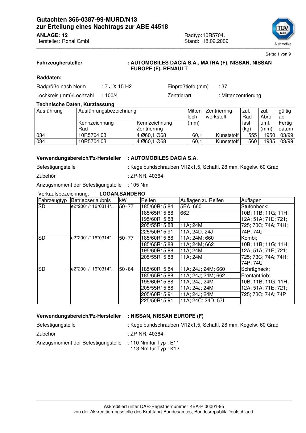 Dieses Gutachten (abe) bezieht sich auf die Alufelge Ronal 10R5704 in der Ausführung 7Jx15 ET 0, Mittenloch 0 mm (KBA 44518). Im PDF findest du typischerweise zulässige Reifengrößen, Auflagen/Anbauhinweise und – je nach Dokument – Hinweise zur Eintragung.